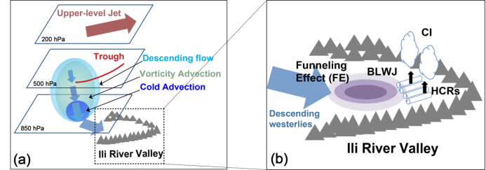 · 基于多种观测资料和高时空分辨率WRF数值模拟,结合准地转ω方程和地形敏感性实验,首次揭示了发生在新疆伊犁河谷(Ili River Valley)地区水平对流卷(HCRs)、边界层西风急流(BLWJ)、峡谷效应(FE)及其相关多尺度系统共同作用下导致的一次极端降水系统的对流触发(CI)机理。本研究发现,研究区处于200 hPa高空偏西风急流出口左侧辐散区,并且受500 hPa中亚低槽的影响,槽后负涡度平流导致研究区上空形成下沉气流。同时在低层的冷平流导致下沉运动进一步增强,从而形成较强且深厚的偏西风下沉气流,并且移动至伊犁河谷中游区域时在FE作用下得到进一步增强,形成BLWJ,并携带较充沛的水汽进入研究区,形成HCRs。该HCRs在BLWJ前沿逐步增强,在低层造成较强的辐合抬升运动,从而导致CI(图5)。该研究为进一步深入研究伊犁河谷地区灾害性强对流天气形成机理提供了一定基础。(Kong & Abulikemu et al., 2022;孔媚霓,2022,硕士学位论文)