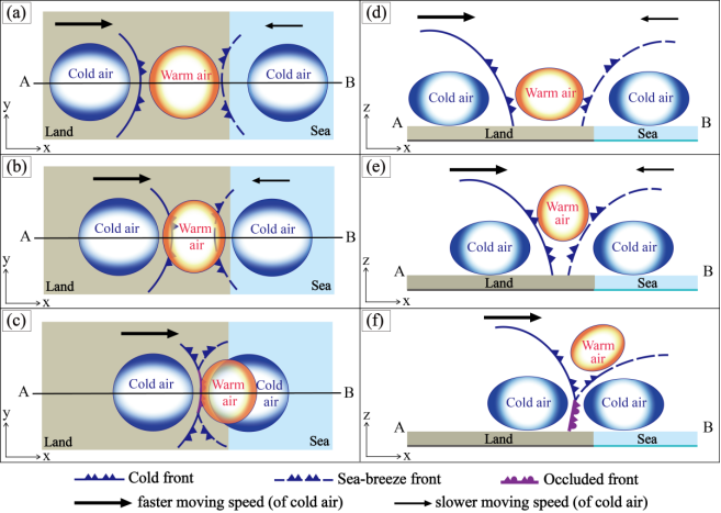 图4. 非典型锢囚过程概念模型。(a,b,c)表示海风锋与阵风锋相向移动并碰撞形成非典型锢囚过程的三个阶段平面示意图。(d-f)表示(a-c)中沿着AB线段的垂直剖面图。图中黑色箭头大小和方向表征两条锋面的移动方向和相对速度大小,(f)中紫色锋面符号表示锢囚锋。