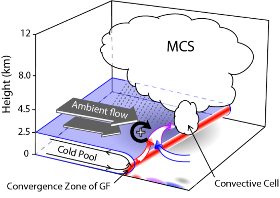 图1. 本次过程中阵风锋附近的对流触发机理概念模型(三维立体效果图)