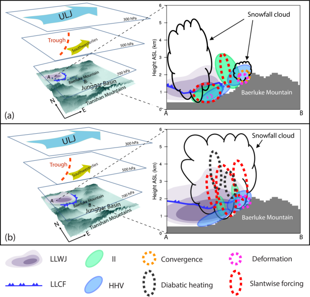图7. 该暴雪过程发生发展机理概念模型。图中表示低层冷锋(low-level cold front, LLCF)和低层偏西风急流(LLWJ)在具有高空急流(ULJ)、惯性不稳定(II)和动热力混合作用(HHV)的环境下由于符合作用(Convergence)、变形作用(Deformation)、非绝热加热作用(Diabatic heating)和扭转作用(即倾斜项,Slantwise forcing)共同导致不稳定能量的释放,为暴雪的发生发展提供重要的强迫作用(He & Abulikemu et al., 2023)。