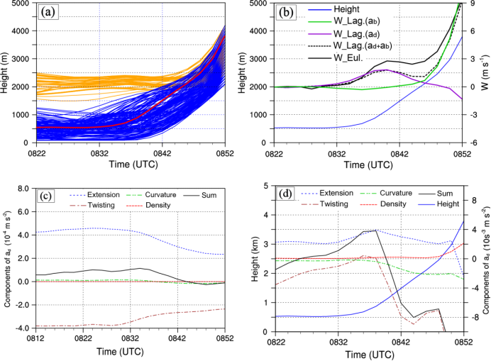 图3. (a)代表性对流单体内空气粒子轨迹高度的随时间变化,其中来自边界层(1500 m)以上和以下的粒子高度高度分别标为橙色和蓝色,代表性粒子轨迹高度标为红色;(b)代表性粒子轨迹高度(蓝色实线)及其轨迹上多种意义的垂直速度随时间变化;(c)两条锋面前方形区域面400 m及以下高度面平均的动力加速度若干个组成部分随时间变化;(d)代表性粒子轨迹上的动力加速度组成部分随时间变化。