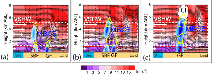 图6. 本次海风锋(SBF)与阵风锋(GF)碰撞导致的对流触发(CI)机理概念模型。其中背景填色表示水平风速(单位:m s-1);蓝色椭圆形符号表示辐合(包括中层阻塞辐合效应,MBCE);白色箭头表示水平风速;白色虚线框表示出现较强的水平风的垂直切变(VSHW)区域;黄色箭头表示由辐合引起的上升气流·(Zheng & Abulikemu et al., 2022。