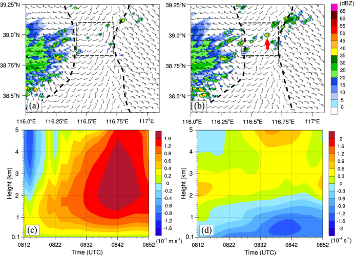 图2. (a-b)模拟的雷达反射率因子(填色)和200 m高度风场(风向杆),左右两侧粗虚线分布表示阵风锋和海风锋,黑色虚线框表示计算相关要素水平面上平均的区域,红色箭头表示选取分析的代表性对流单体;(c)和(d)分别表示水平面上算的平均垂直速度(填色)和水平散度(填色)。