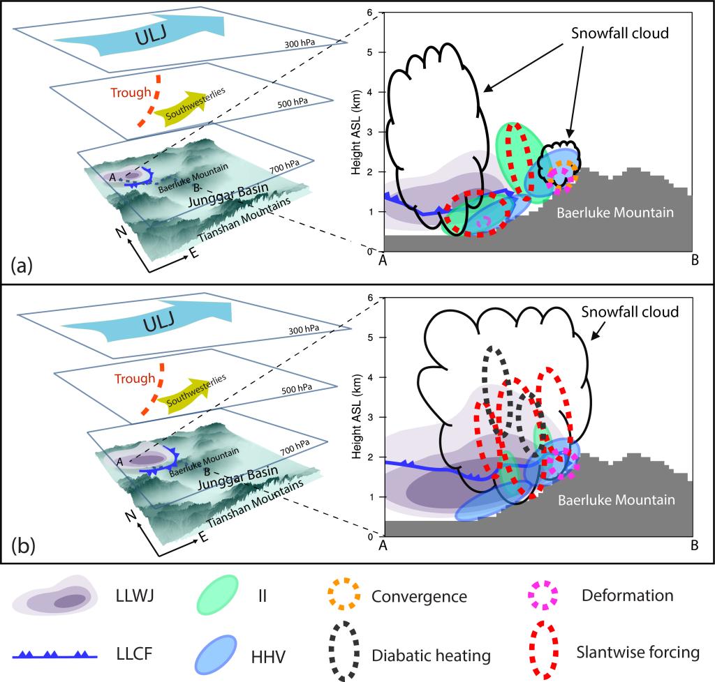 ·基于多种气象观测资料和高时空分辨率WRF数值模拟,揭示一次发生在新疆准噶尔盆地西部山区(塔城地区巴尔鲁克山)的一次暴雪过程的发生发展机理,发现低空急流和低层冷锋不仅从不稳定能量的角度为暴雪天气的发生发展过程提供了重要的贡献,而且还提供了重要的释放不稳定能量所需的锋生强迫作用(图7)。该成果为该地区暴雪天气预测预警提供了理论参考(He & Abulikemu et al., 2023)。  图7. 该暴雪过程发生发展机理概念模型。图中表示低层冷锋(low-level cold front, LLCF)和低层偏西风急流(LLWJ)在具有高空急流(ULJ)、惯性不稳定(II)和动热力混合作用(HHV)的环境下由于符合作用(Convergence)、变形作用(Deformation)、非绝热加热作用(Diabatic heating)和扭转作用(即倾斜项,Slantwise forcing)共同导致不稳定能量的释放,为暴雪的发生发展提供重要的强迫作用(He & Abulikemu et al., 2023)。 |