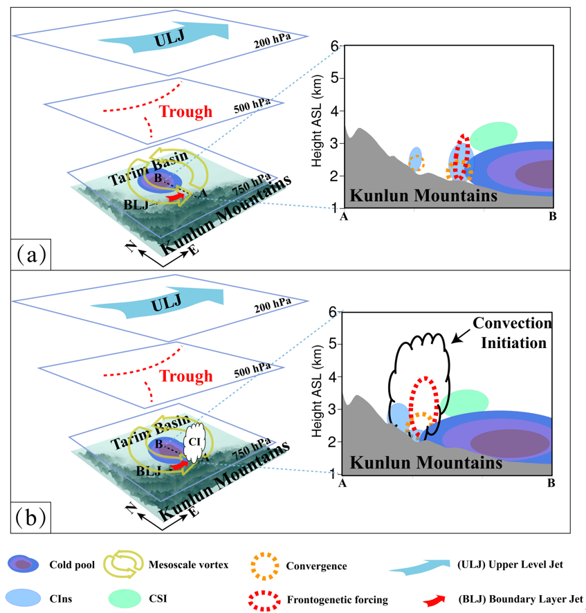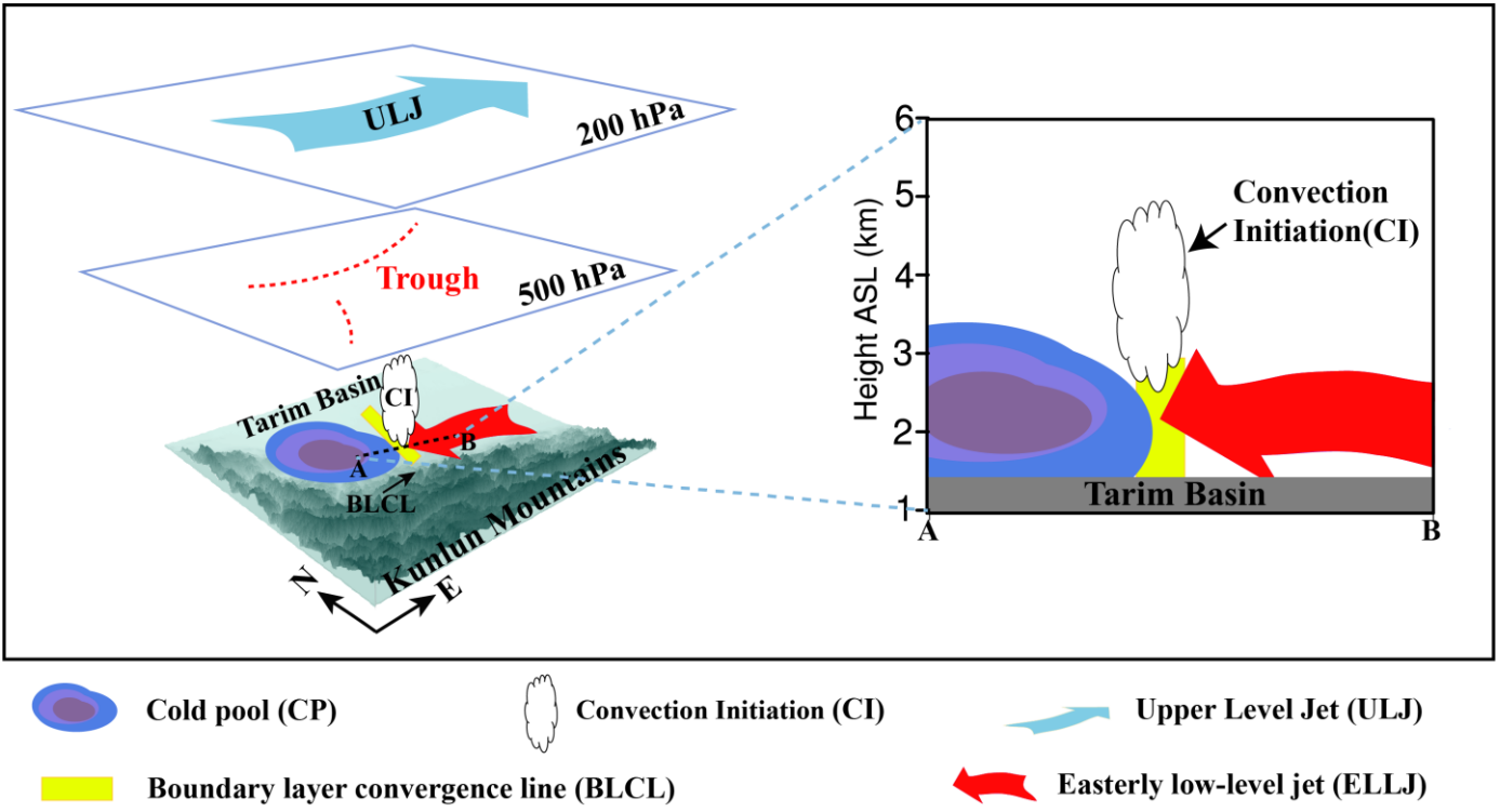图8. 昆仑山北坡复杂下垫面条件下发生的一次暴雨天气过程中与中尺度气旋、边界层急流(Boundary Layer Jet,BLJ)和冷池(Cold Pool,CP)等多个系统共同作用的对流触发(CI)机理概念模型(Sun & Abulikemu et al., 2023)。 |