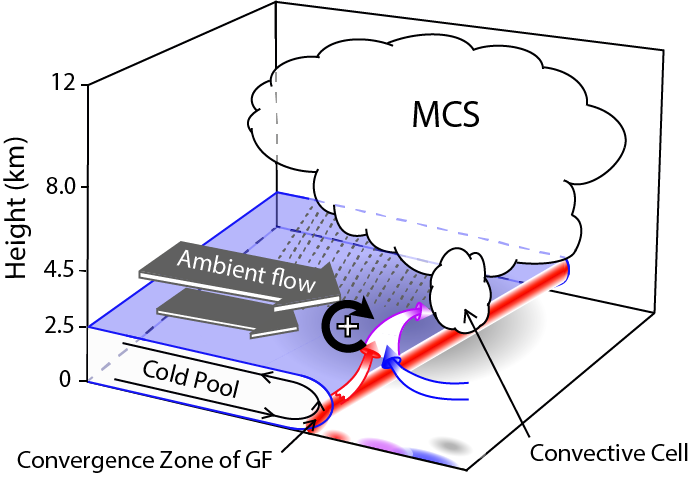 图1. 渤海湾地区一次阵风锋(冷池)与其上方中层垂直风切变导致的对流触发机理概念模型(Abulikemu et al., 2019)。