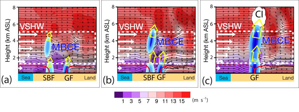 ·基于多种气象观测资料和高时空分辨率WRF数值模拟,揭示一次渤海湾地区碰撞型海风锋(MSBF)导致的对流触发(CI)机理,并首次提出MSBF在碰撞过程中出现的中层阻塞辐合效应(Mid-level Blocking Convergence Effect, MBCE)概念。本研究发现,海风锋(SBF)和阵风锋(GF)在相向移动过程中,在两者之间的弱风速区随着两条锋面的相向移动逐步被挤压升高到中层,当SBF后方中层的较高风速的气流遇到该弱风速区时形成气流阻塞,形成该中层气流的辐合抬升,从而对该高度的空气粒子带来较强的辐合抬升作用,该过程被称为“中层阻塞辐合效应”(MBCE)。该MBCE在两条锋面相向移动靠近过程中逐步增强,为低层的辐合抬升作用提供进一步“接力”抬升作用,在两条锋面碰撞过程中提供持续且较强的动力强迫。此外,在中低层出现较强的风切变(即水平风的垂直切变,VSHW)提供扭转作用,与MBCE共同为空气粒子提供动力加速度,从而导致CI(图6)。该研究有助于提高MSBF有关CI机理的认识。(Zheng & Abulikemu et al., 2022)  图6. 本次海风锋(SBF)与阵风锋(GF)碰撞导致的对流触发(CI)机理概念模型。其中背景填色表示水平风速(单位:m s-1);蓝色椭圆形符号表示辐合(包括中层阻塞辐合效应,MBCE);白色箭头表示水平风速;白色虚线框表示出现较强的水平风的垂直切变(VSHW)区域;黄色箭头表示由辐合引起的上升气流·(Zheng & Abulikemu et al., 2022。 |