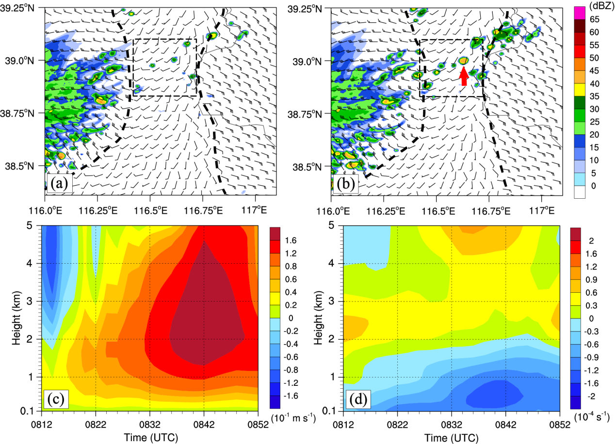 ·基于发生在渤海湾地区的强对流天气过程的高时空分辨率WRF数值模拟,揭示发生在阵风锋(GF)前沿的对流触发(CI)机理。本研究发现,在GF上方约3-5 km处的环境垂直风切变导致的水平涡度形成低气压扰动,从而形成一个垂直向上的气压梯度力,在该气压梯度力作用下,GF前沿向前倾斜的上升气流和来自GF前方的另一支气流辐合后形成的上升气流中形成了更强的上升运动,从而造成CI(图1和图2)。本研究提出了与经典的RKW理论(Rotunno等,1988)不同的一种中层垂直风切变影响CI的新观点,有助于提高对CI机理的认识(Abulikemu et al., 2019)。
