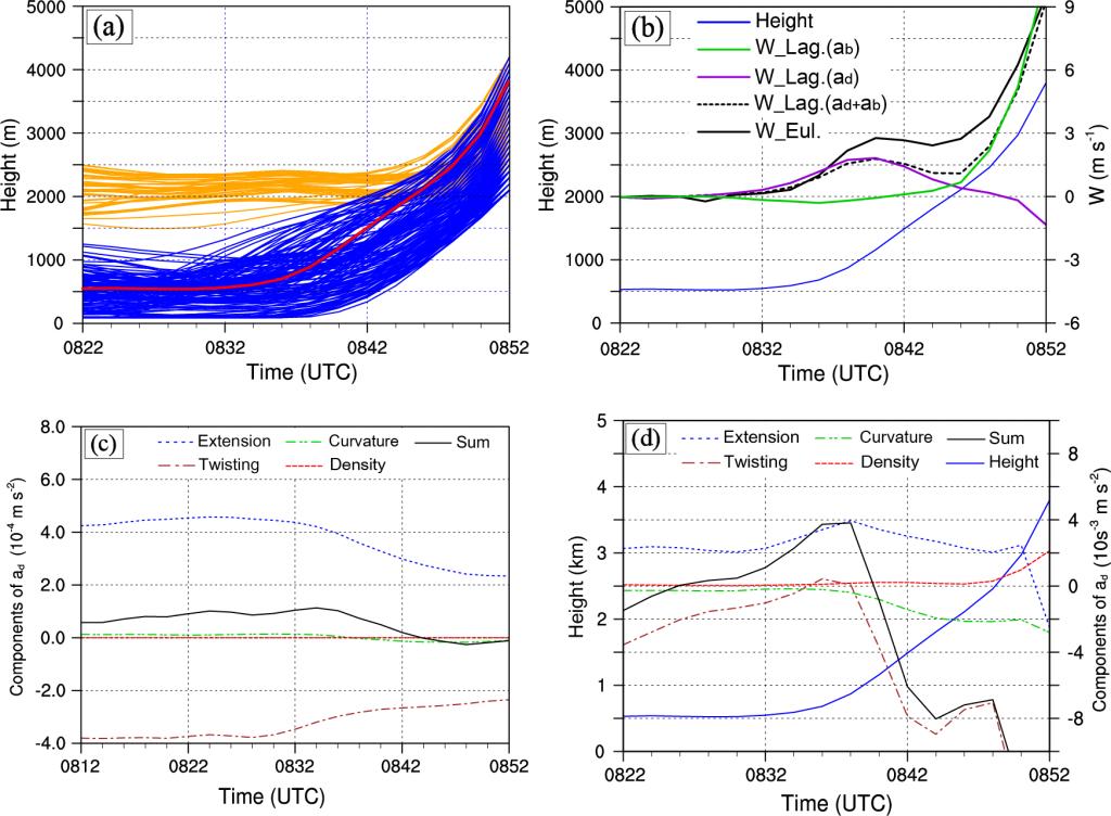 ·基于多种观测和高时空分辨率WRF数值模拟,结合空气粒子后向轨迹和垂直加速度动量诊断分析,揭示一次发生在渤海湾地区的碰撞型海风锋(Merger-type Sea-Breeze Front, MSBF)在碰撞前发生的对流触发(CI)机理。该研究发现,一条海风锋(SBF)和阵风锋(GF)在相向移动到相互距离大约为25~30 km时,在两者之间中低层形成“远距离辐合效应”,而且在有利的热力特征(即条件性不稳定)条件下,为两条锋面之间的部分空气粒子提供动力抬升作用,从而导致CI(图2和图3)。该研究对渤海湾地区此类CI机理的进一步认识具有较重要的参考价值(Abulikemu et al., 2016)。  图2. (a-b)模拟的雷达反射率因子(填色)和200 m高度风场(风向杆),左右两侧粗虚线分布表示阵风锋和海风锋,黑色虚线框表示计算相关要素水平面上平均的区域,红色箭头表示选取分析的代表性对流单体;(c)和(d)分别表示水平面上算的平均垂直速度(填色)和水平散度(填色)(Abulikemu et al., 2016)。  图3. (a)代表性对流单体内空气粒子轨迹高度的随时间变化,其中来自边界层(1500 m)以上和以下的粒子高度高度分别标为橙色和蓝色,代表性粒子轨迹高度标为红色;(b)代表性粒子轨迹高度(蓝色实线)及其轨迹上多种意义的垂直速度随时间变化;(c)两条锋面前方形区域面400 m及以下高度面平均的动力加速度若干个组成部分随时间变化;(d)代表性粒子轨迹上的动力加速度组成部分随时间变化(Abulikemu et al., 2016)。 |