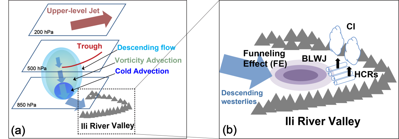 ·基于多种观测资料和高时空分辨率WRF数值模拟,结合准地转ω方程和地形敏感性实验,首次揭示了发生在新疆伊犁河谷(Ili River Valley)地区水平对流卷(HCRs)、边界层西风急流(BLWJ)、峡谷效应(FE)及其相关多尺度系统共同作用下导致的一次极端降水系统的对流触发(CI)机理。本研究发现,研究区处于200 hPa高空偏西风急流出口左侧辐散区,并且受500 hPa中亚低槽的影响,槽后负涡度平流导致研究区上空形成下沉气流。同时在低层的冷平流导致下沉运动进一步增强,从而形成较强且深厚的偏西风下沉气流,并且移动至伊犁河谷中游区域时在FE作用下得到进一步增强,形成BLWJ,并携带较充沛的水汽进入研究区,形成HCRs。该HCRs在BLWJ前沿逐步增强,在低层造成较强的辐合抬升运动,从而导致CI(图5)。该研究为进一步深入研究伊犁河谷地区灾害性强对流天气形成机理提供了一定基础。(Kong & Abulikemu et al., 2022;孔媚霓,2022,硕士学位论文)  图5. 本次伊犁河谷地区对流触发机理的概念模型。(a)和(b)分别表示天气尺度和中尺度环境特征。灰色三角形表示天山山脉(Kong & Abulikemu et al., 2022)。 |