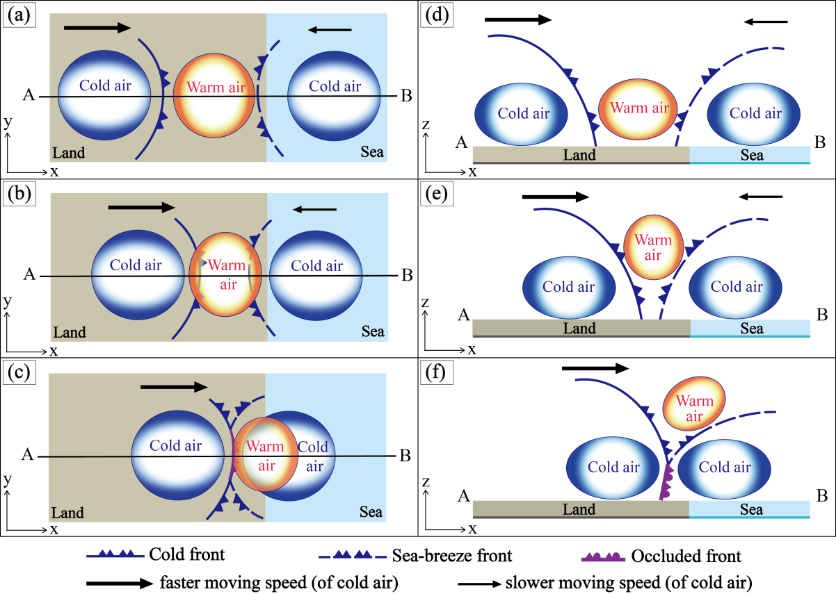 ·利用高时空分辨率WRF数值模拟研究一次发生在渤海湾地区的海风锋(SBF)与阵风锋(GF)的碰撞过程,首次提出此类中尺度锋面碰撞导致的“非典型锢囚过程”概念。该研究发现,两条锋面在碰撞过程中能够把两者之间的暖气团挤压抬升到SBF上方,形成类似于经典锋面气旋理论中的锢囚结构。该过程并没有在温带气旋中发生,而且其中两条锋面分别为SBF和GF,均具有冷锋性质,该过程的时空尺度都比经典锋面气旋理论中的锢囚过程要小,因此,该过程被称为“非典型锢囚过程”(图4)(Abulikemu et al., 2015)。  图4. 非典型锢囚过程概念模型。(a,b,c)表示海风锋与阵风锋相向移动并碰撞形成非典型锢囚过程的三个阶段平面示意图。(d-f)表示(a-c)中沿着AB线段的垂直剖面图。图中黑色箭头大小和方向表征两条锋面的移动方向和相对速度大小,(f)中紫色锋面符号表示锢囚锋(Abulikemu et al., 2015)。 |